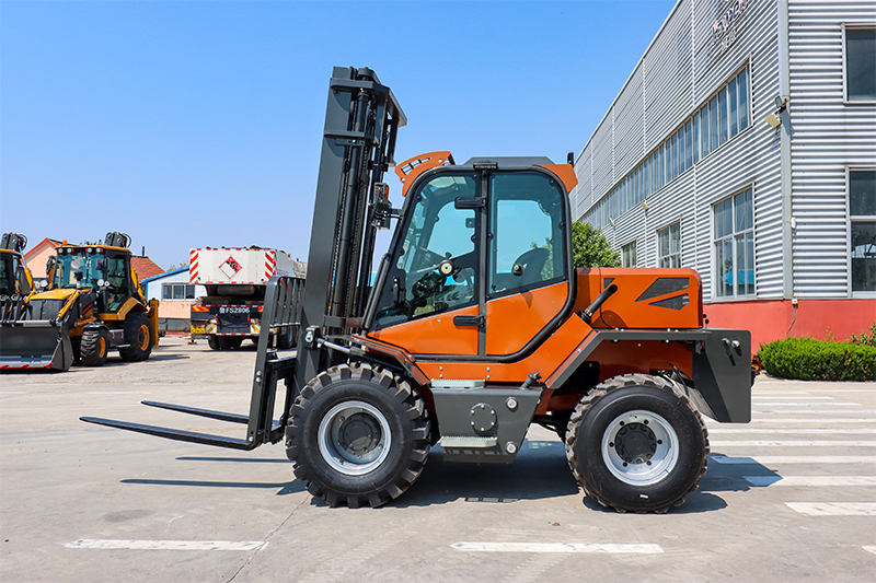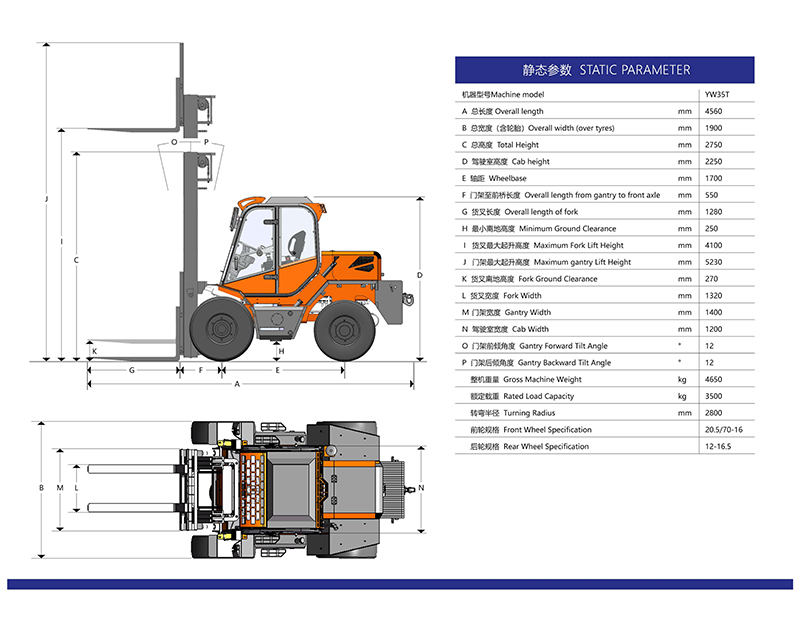 一體式越野叉車(YW35T)為加厚貨叉,精選鋼材提升載重,前輪20.5半實心輪胎,后輪12-16.5真空鋼絲輪胎,后輪轉(zhuǎn)向,承載 力和脫困能力更強,軸距短,一體式車架,無鉸接,轉(zhuǎn)彎半徑小,轉(zhuǎn)向角度大,更適合狹小 空間作業(yè),加裝安全示寬警示燈,保證夜間安全距離作業(yè),發(fā)動機后機蓋可向上開啟,更換濾芯更容易,后方擋泥板承載力強,可 供保養(yǎng)人員站立。
